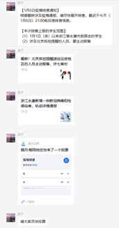 为了让同学们及时了解疫情发展情况,防止误入风险区域,党员同志轮流收集整理当天全国有新增的地区,并将官方公布的确诊轨迹信息公布在群里,方便同学们自查是否存在时空交集,助力疫情防控工作。